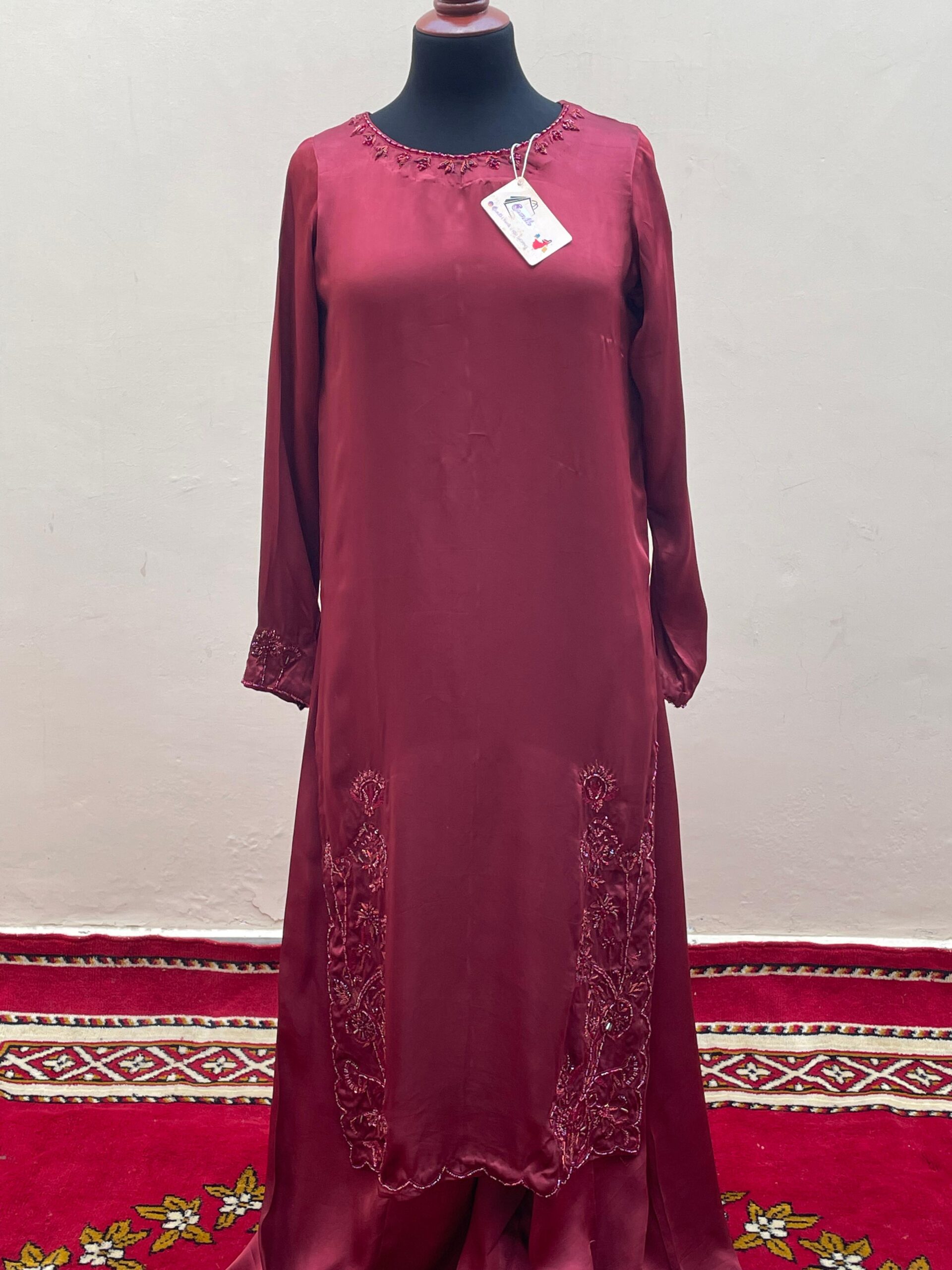 Crafted in luxurious tussle silk, this deep maroon outfit exudes timeless grace. The shirt and dupatta share the same rich fabric, creating a harmonious flow. Intricate handwork graces the neckline, sleeves, and front—each motif echoing elegance of the stone-embellished daman.